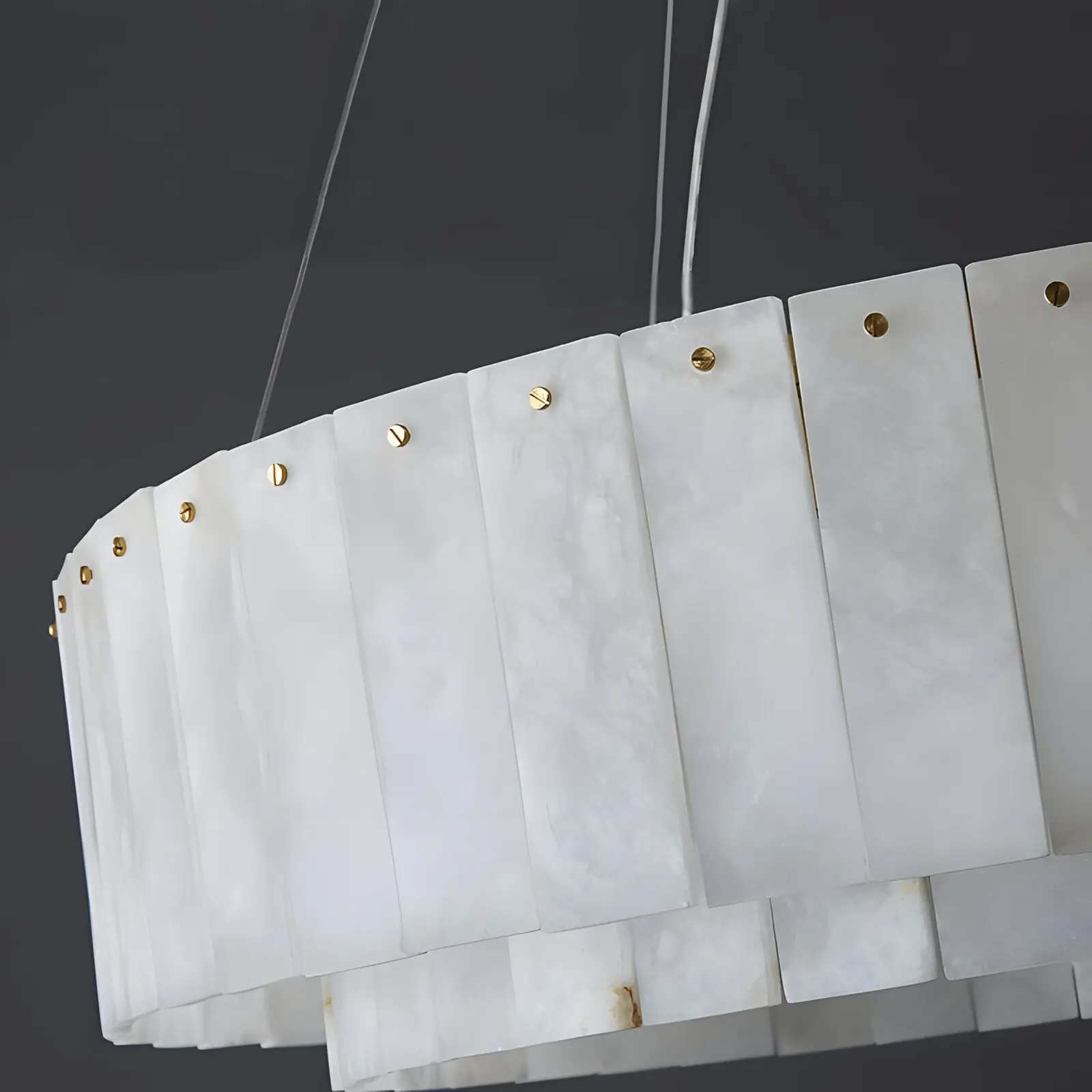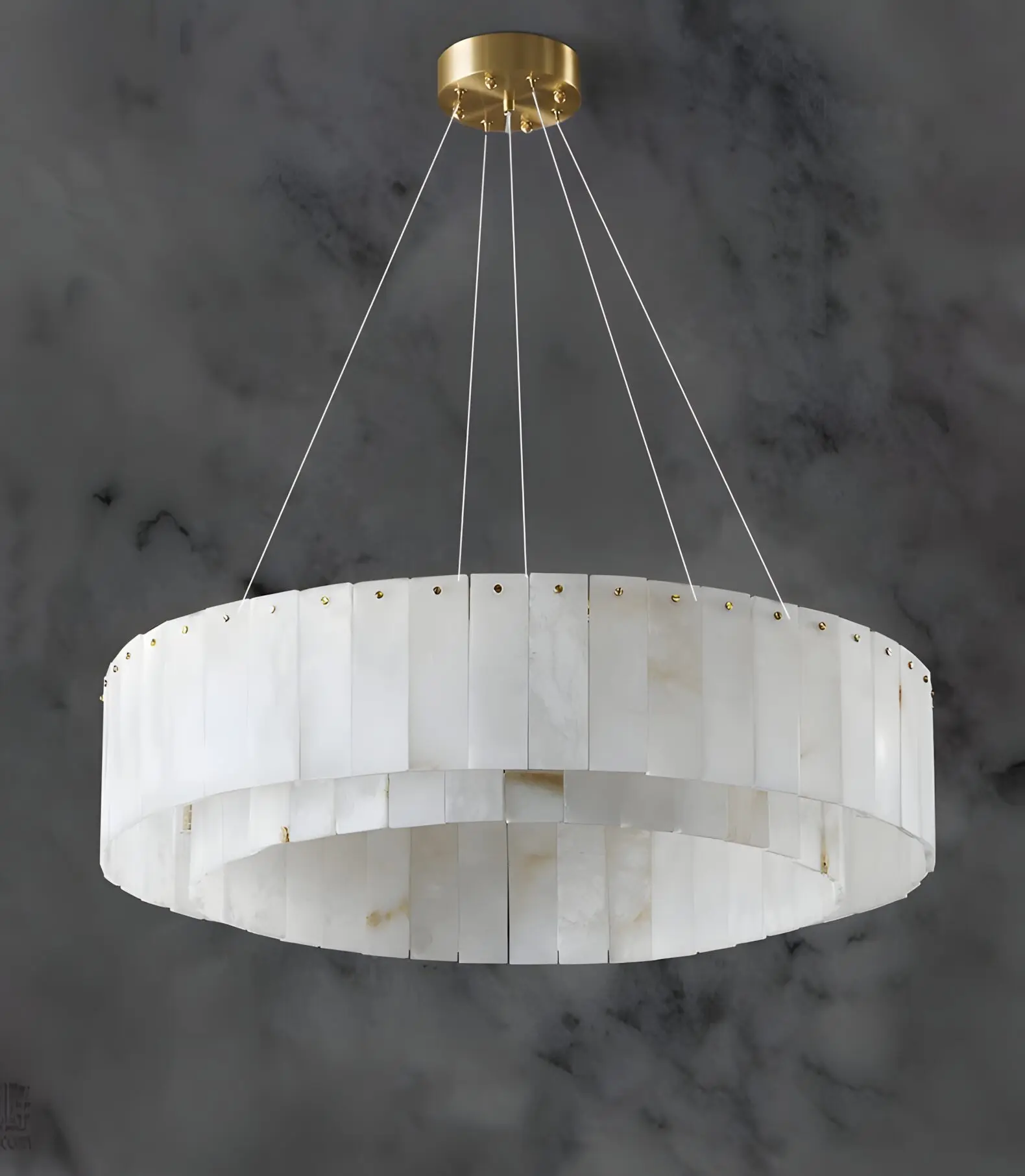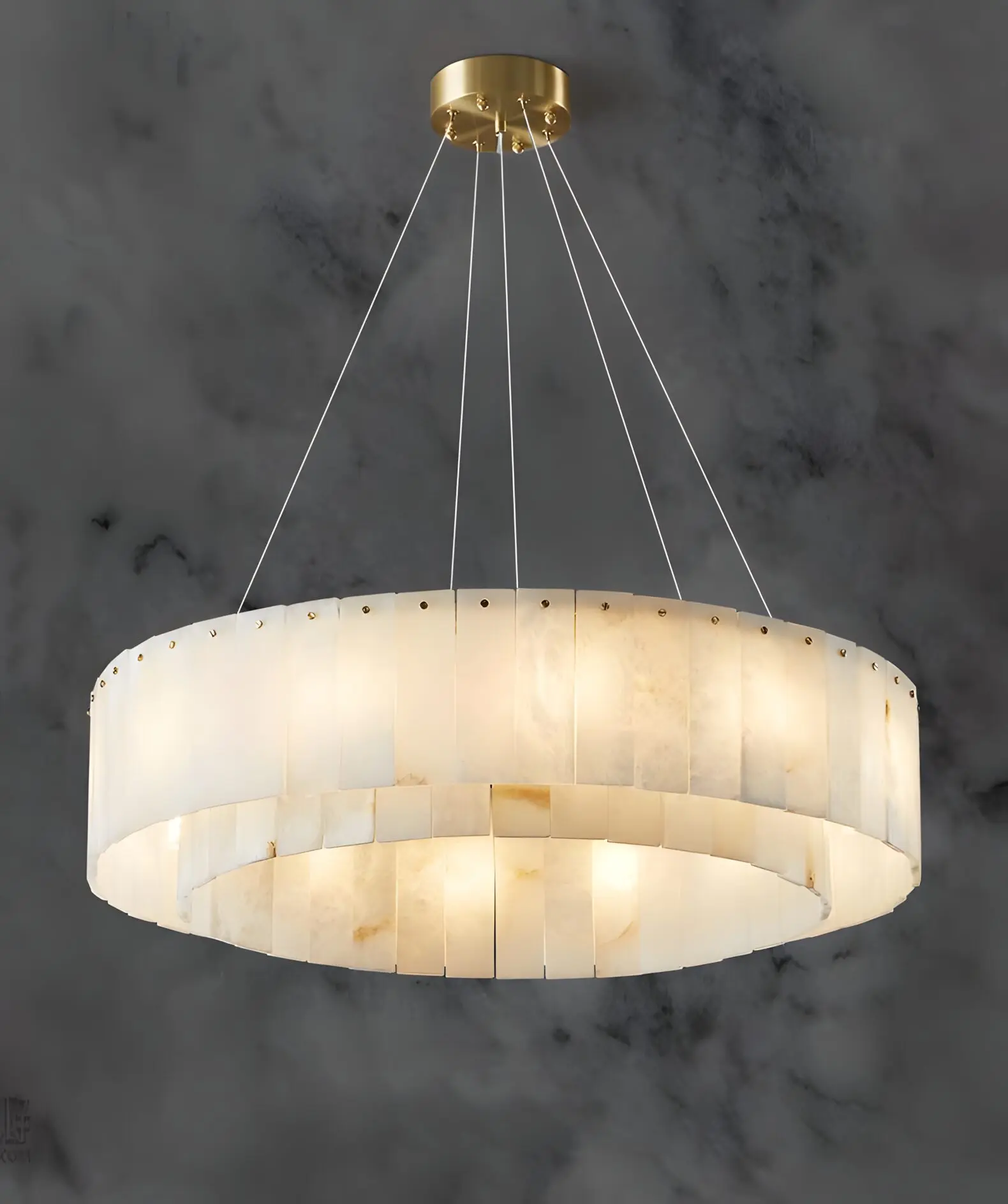 A modern and luxurious style. It is round in shape, with layered alabaster panels all around. The material is high-quality brass and natural alabaster. The brass ceiling plate and fasteners have a polished finish, looking shiny and durable. The craftsmanship is excellent—each alabaster panel is carefully cut and assembled with brass, making the lamp unique.