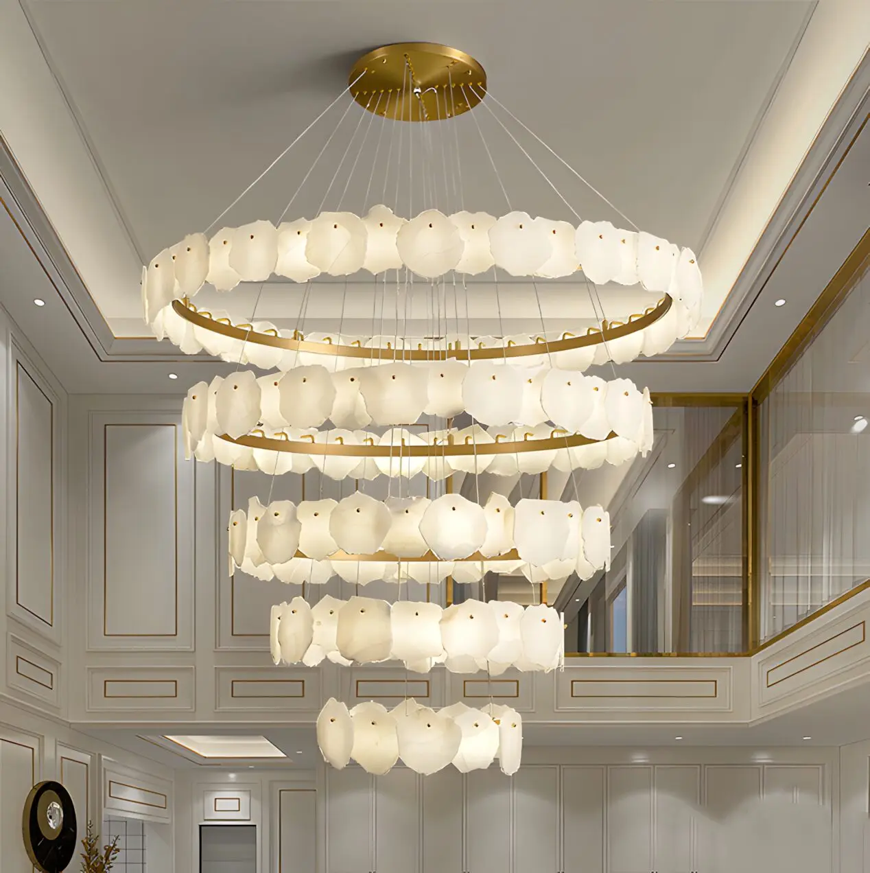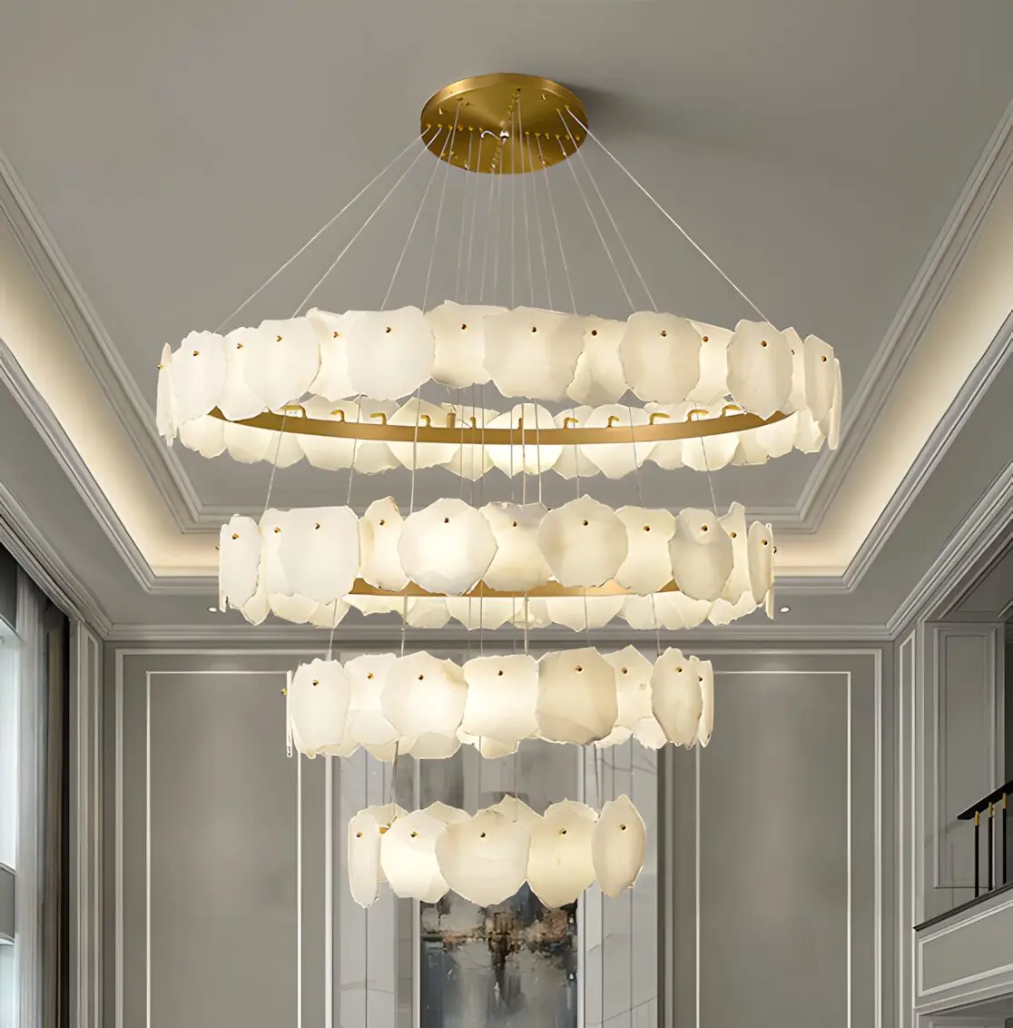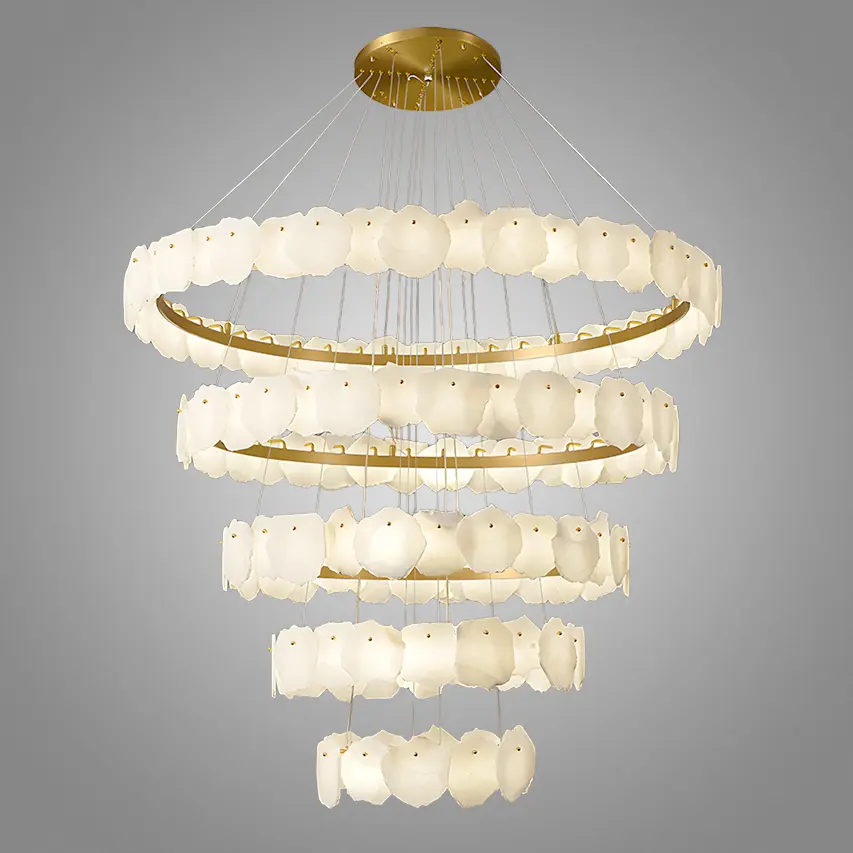 Make a statement in your home with our Burton Tiered Chandelier. Featuring a sleek design with stacked circular LED lights surrounded by rich alabaster and accented with a stunning gold finish, this contemporary chandelier adds a touch of luxury and sophistication to any space. It’s the perfect way to bring a unique, upscale vibe to your room.