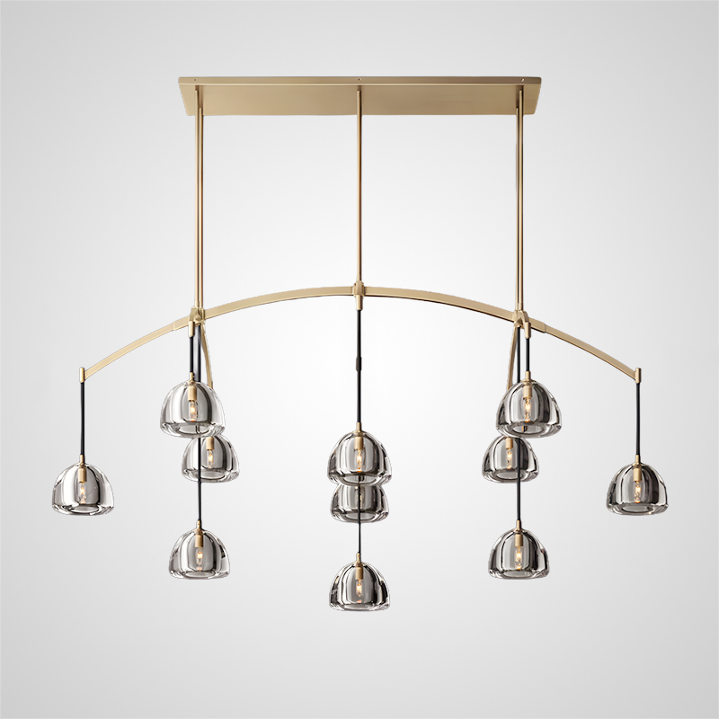 The modern brass arch chandelier features elegant glass bell shades, suspended in a sleek curved design. The glass shades are designed to distribute light evenly, making it perfect for brightening up large spaces. Its simple yet bold design ensures it stands out while blending seamlessly with various décor styles.