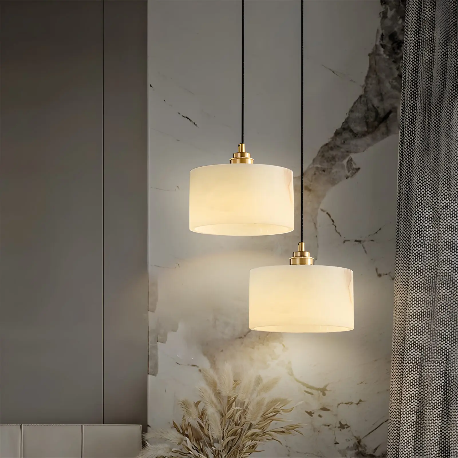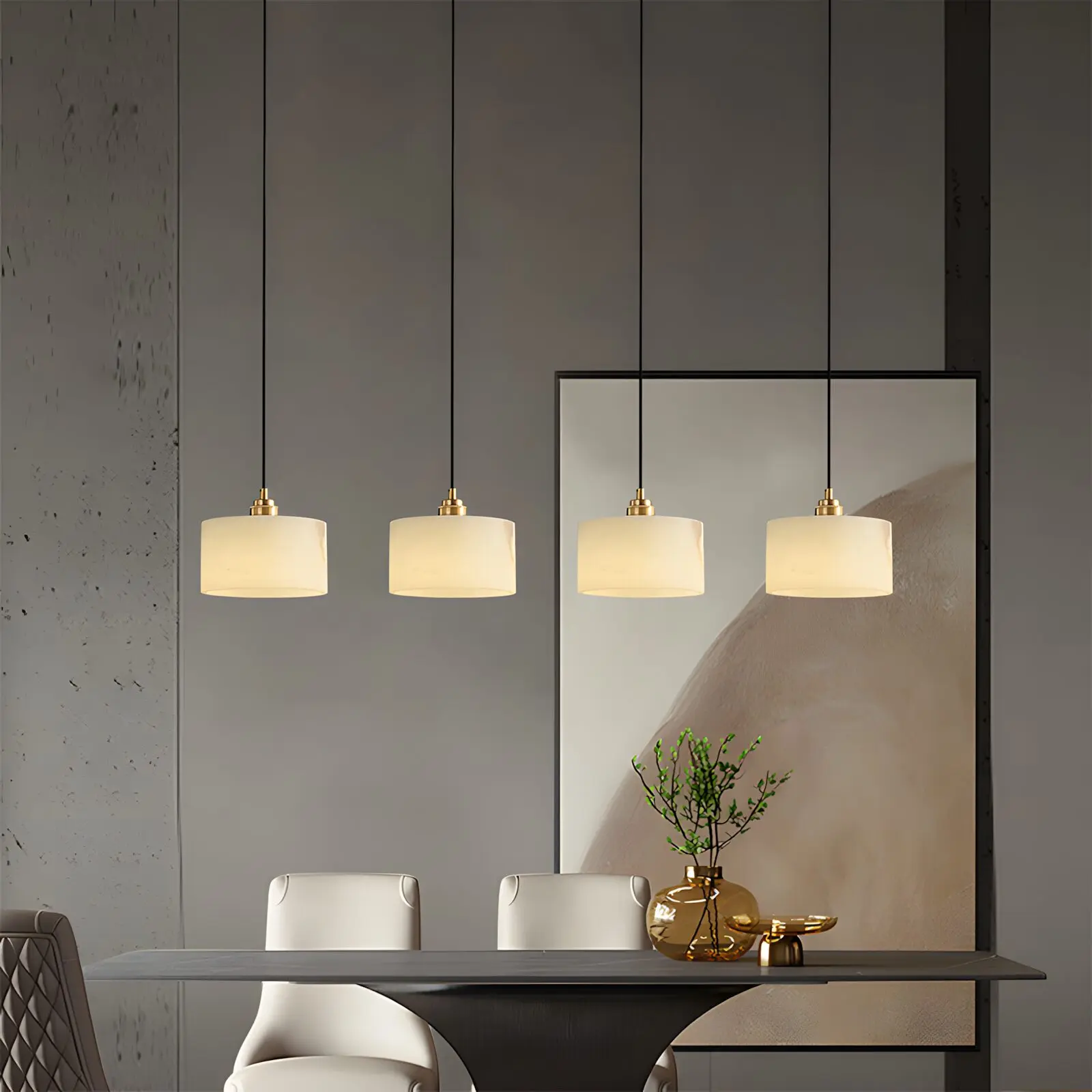 With six individual lights suspended from adjustable black cords, it creates an elegant and clean aesthetic in any space. Cylindrical marble stone design, diffuses the light beautifully, providing a soft, warm glow, adding a refined touch to any room. Perfect for modern interiors.