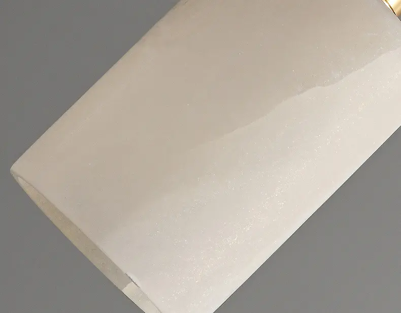 Its shape is a cascading cluster of alabaster pendants, each hanging from a black cord at varying heights. It is made of brass and alabaster. The brass parts have a smooth, shiny surface, ensuring long-lasting use. The making process is meticulous—artisans assemble the alabaster pendants and brass components with great care, resulting in a one-of-a-kind piece.