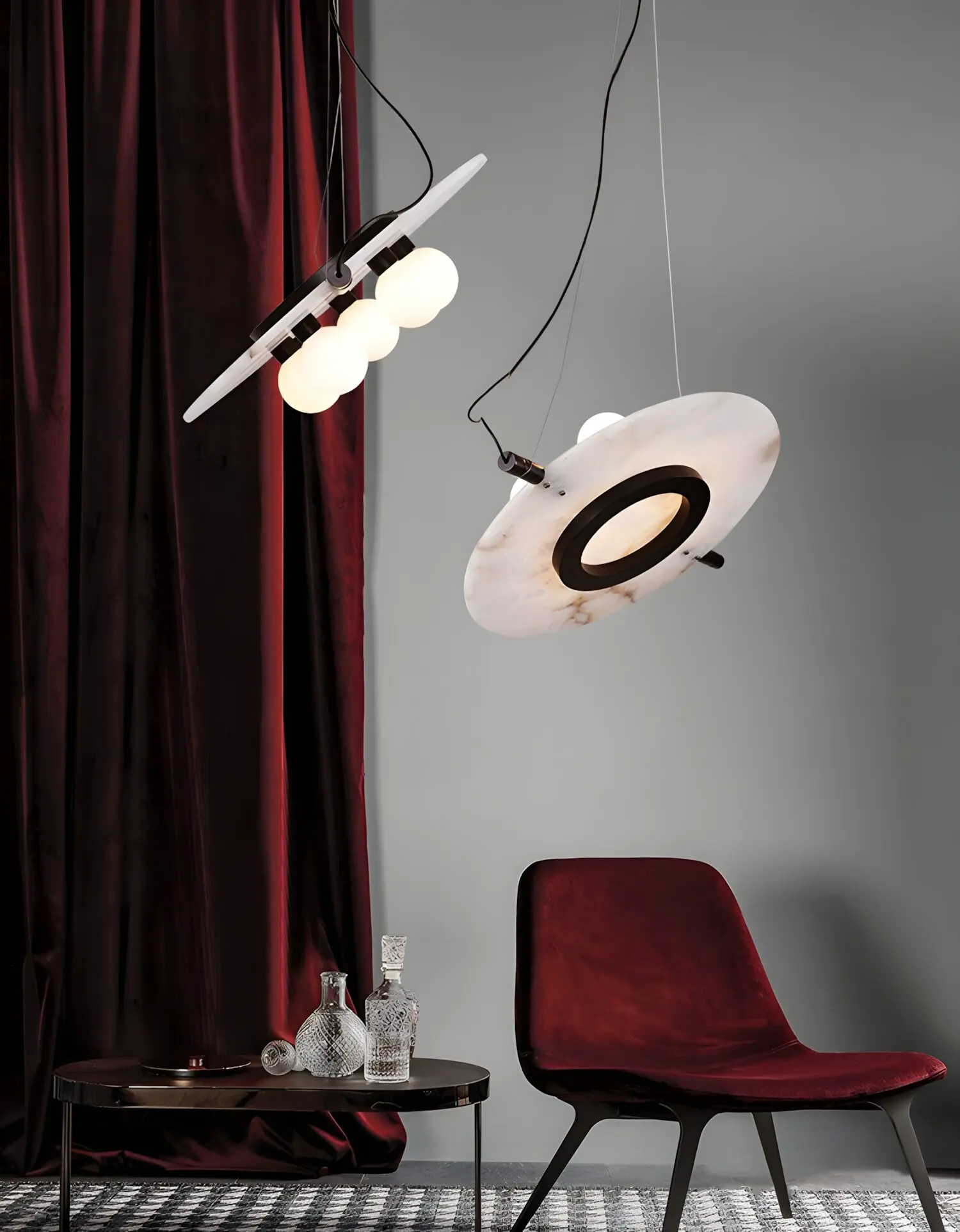 Elevate your home decor with this modern marble pendant light. Featuring a unique circular motif, it delivers a bold yet refined look. The high-quality marble material enhances its timeless design, and the matte black frame adds a sophisticated edge. Simple yet functional, this light is crafted with attention to detail, providing both style and efficiency.