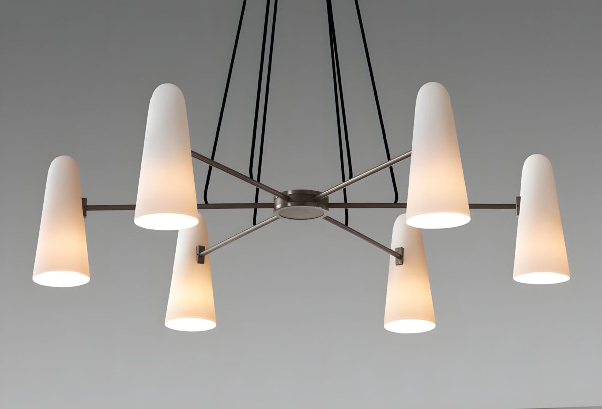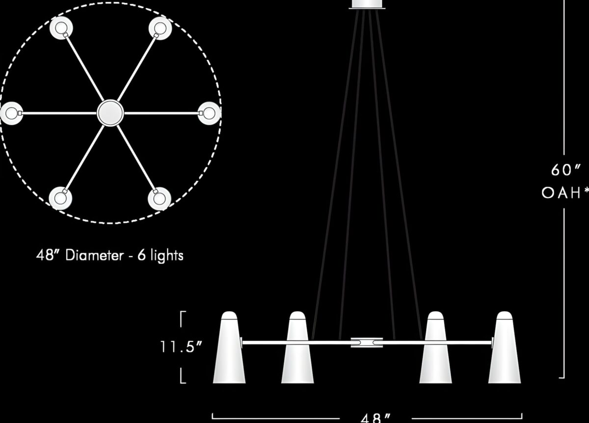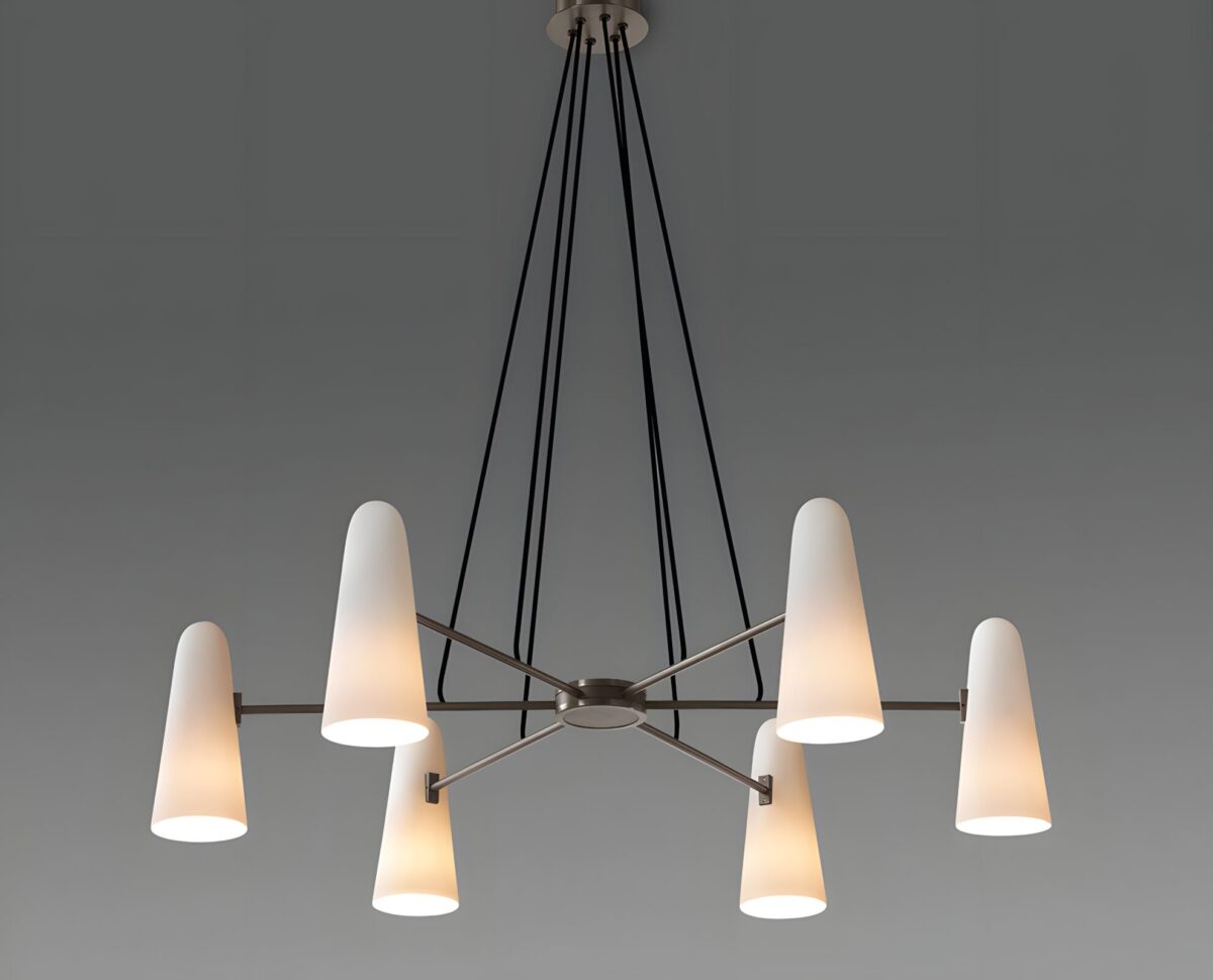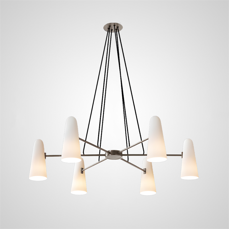 Elegant frosted glass chandelier, designed with a durable brass structure. The six individual glass shades are shaped to diffuse light softly across the room. The clean lines and subtle finish make it ideal for any modern or transitional space. The sturdy brass construction ensures lasting quality, while the frosted glass provides a calming ambiance.