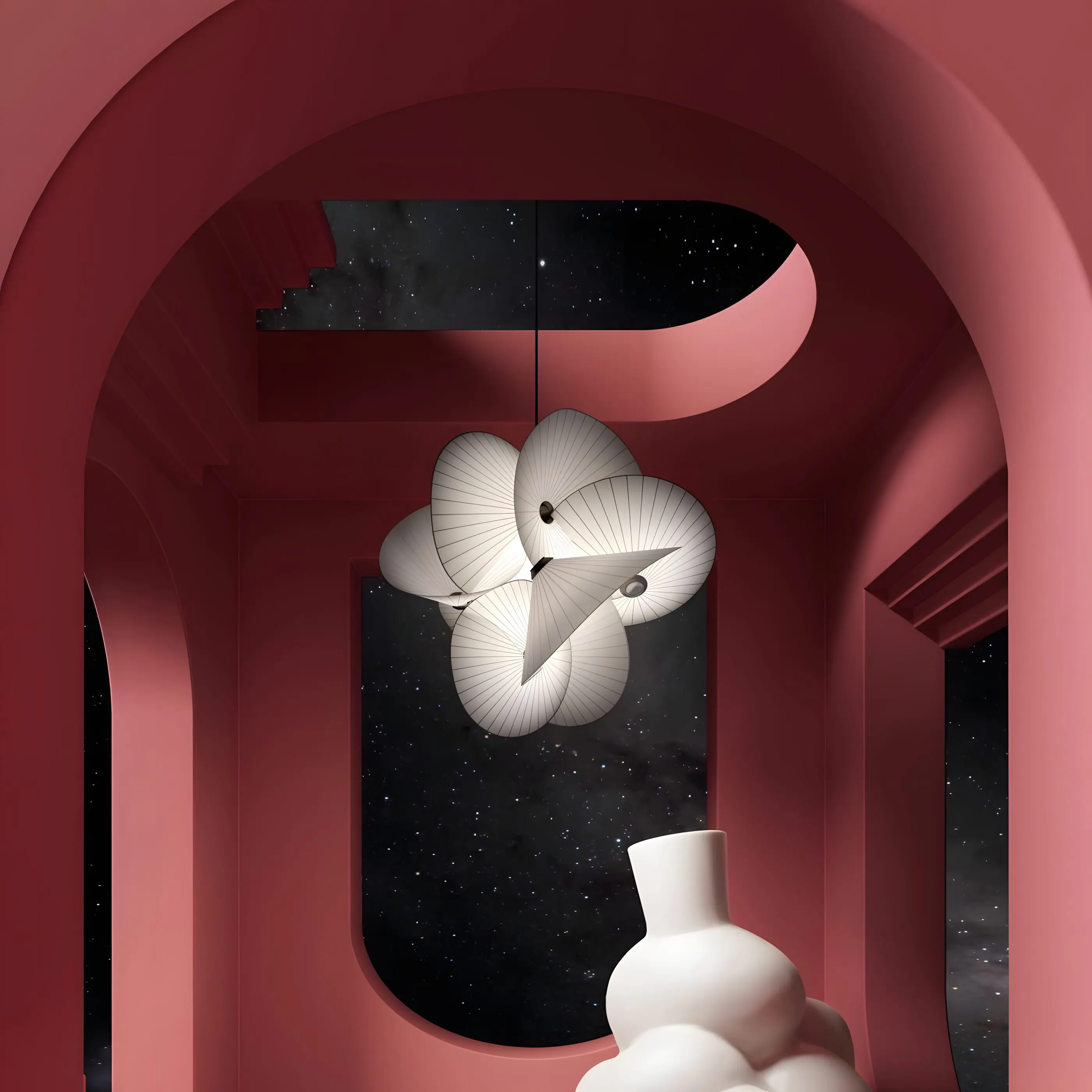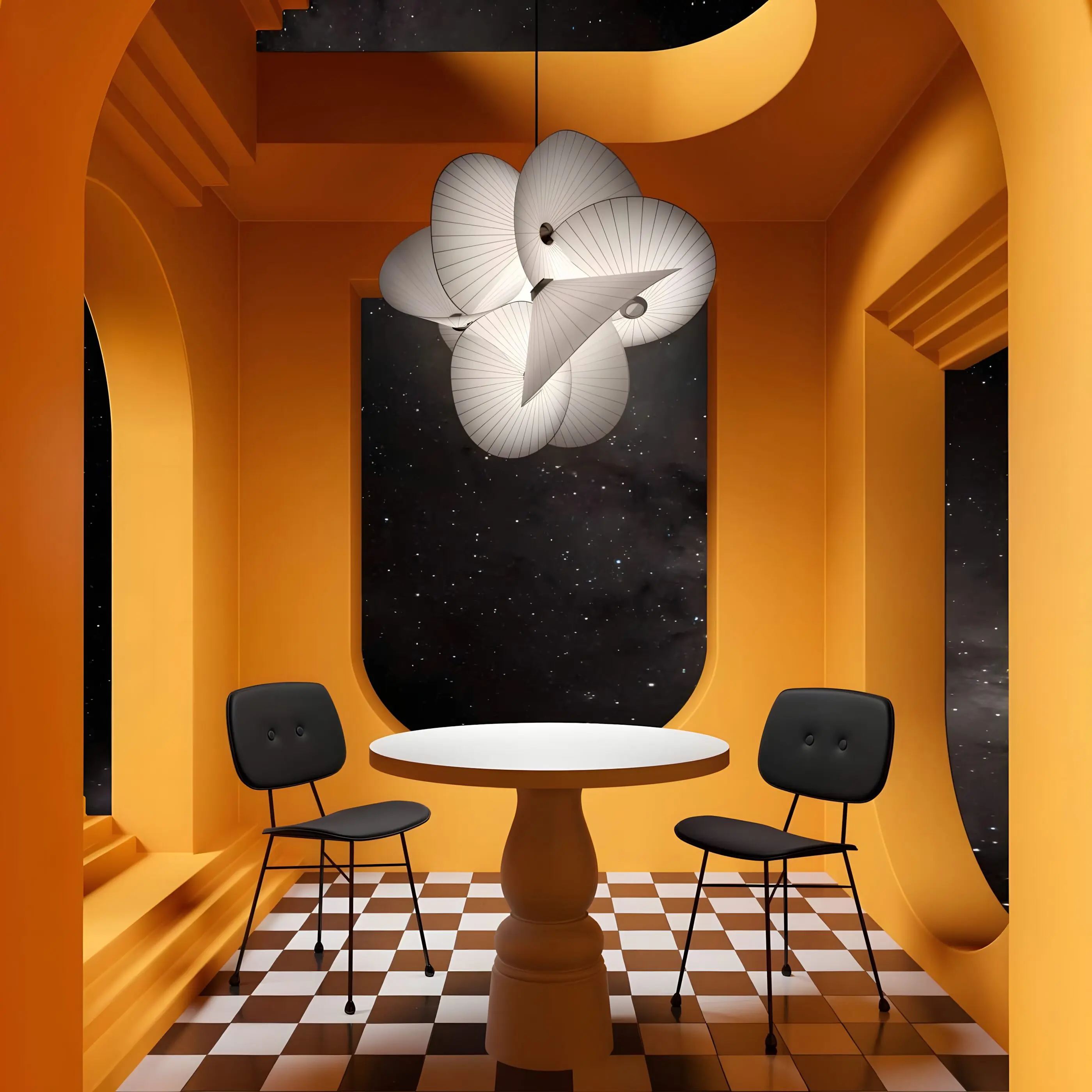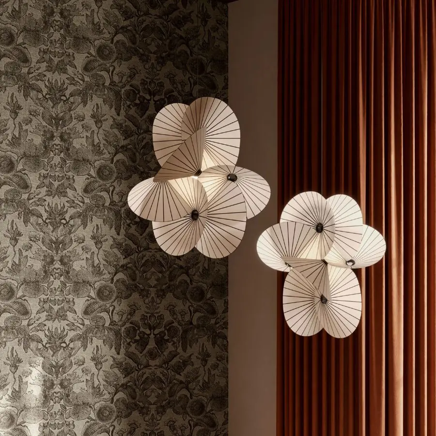This Moooi chandelier looks light, as if floating in the air. Its design began with bending a sheet of paper. We tested how paper can stretch and curve, seeing what shapes it could form. Dark lines make it seem like a never – ending upward spiral. The semi – transparent material curves naturally, spreading light evenly.