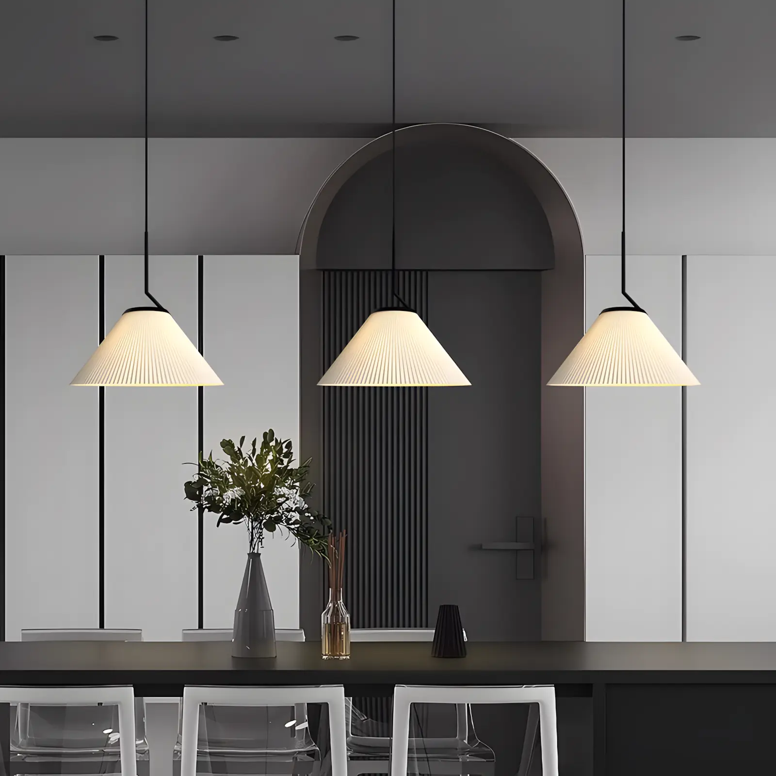 The Nebra Pleated Pendant Lamp adds elegance with its simple, stylish design. It has a white pleated shade that brings texture, and a black metal geometric arm. The sleek metal contrasts with the soft shade, fitting both modern and classic rooms. Perfect for dining areas or bedrooms, it gives a timeless look.