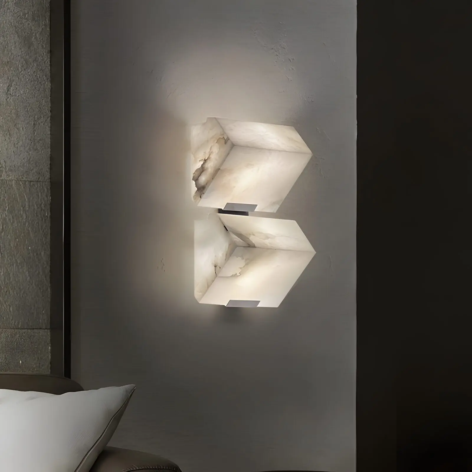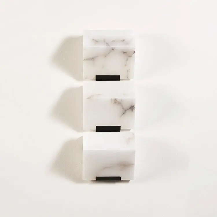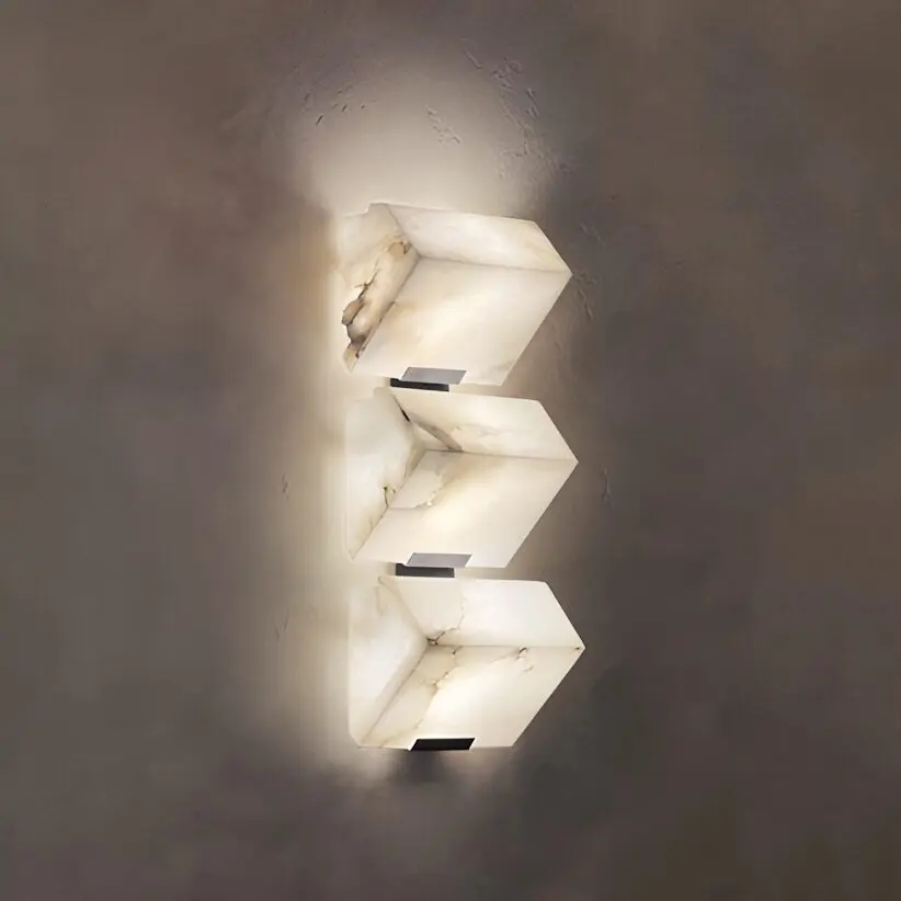 Salute to the master–Pierre Chareau, sloping block series completely covering the bulb with a triangular prism made of assembled alabaster panels,  created in 1923, is mounted on a black metal fixture that contrasts with the natural minerality and veining of the diffuser. The wall light is available in single, double, and triple block versions.