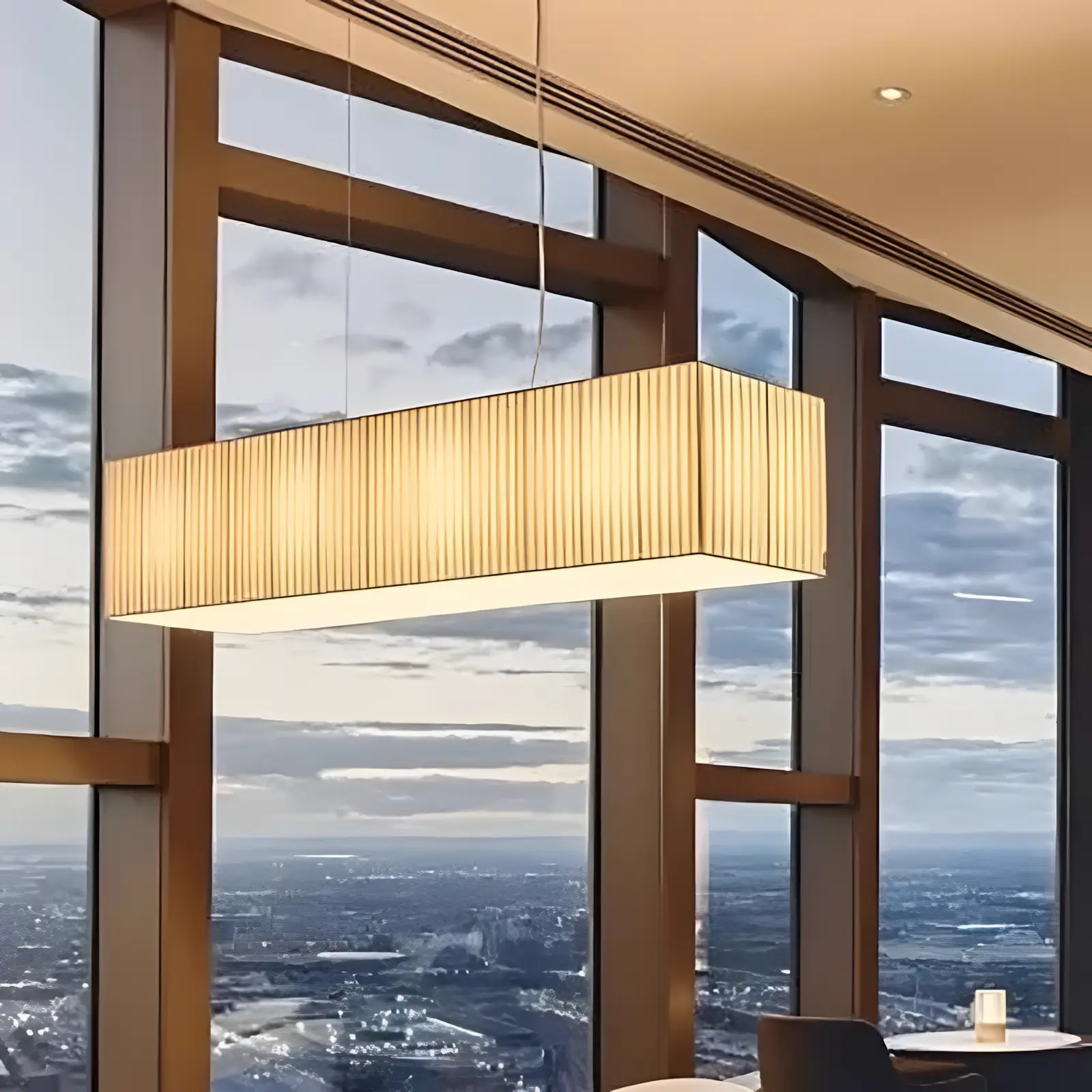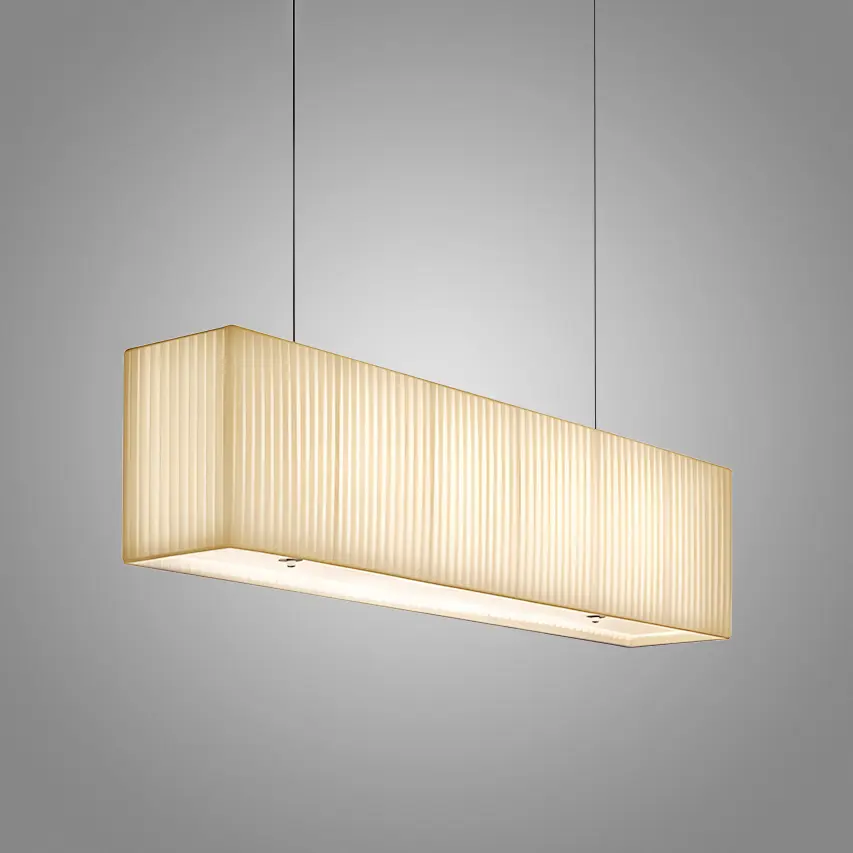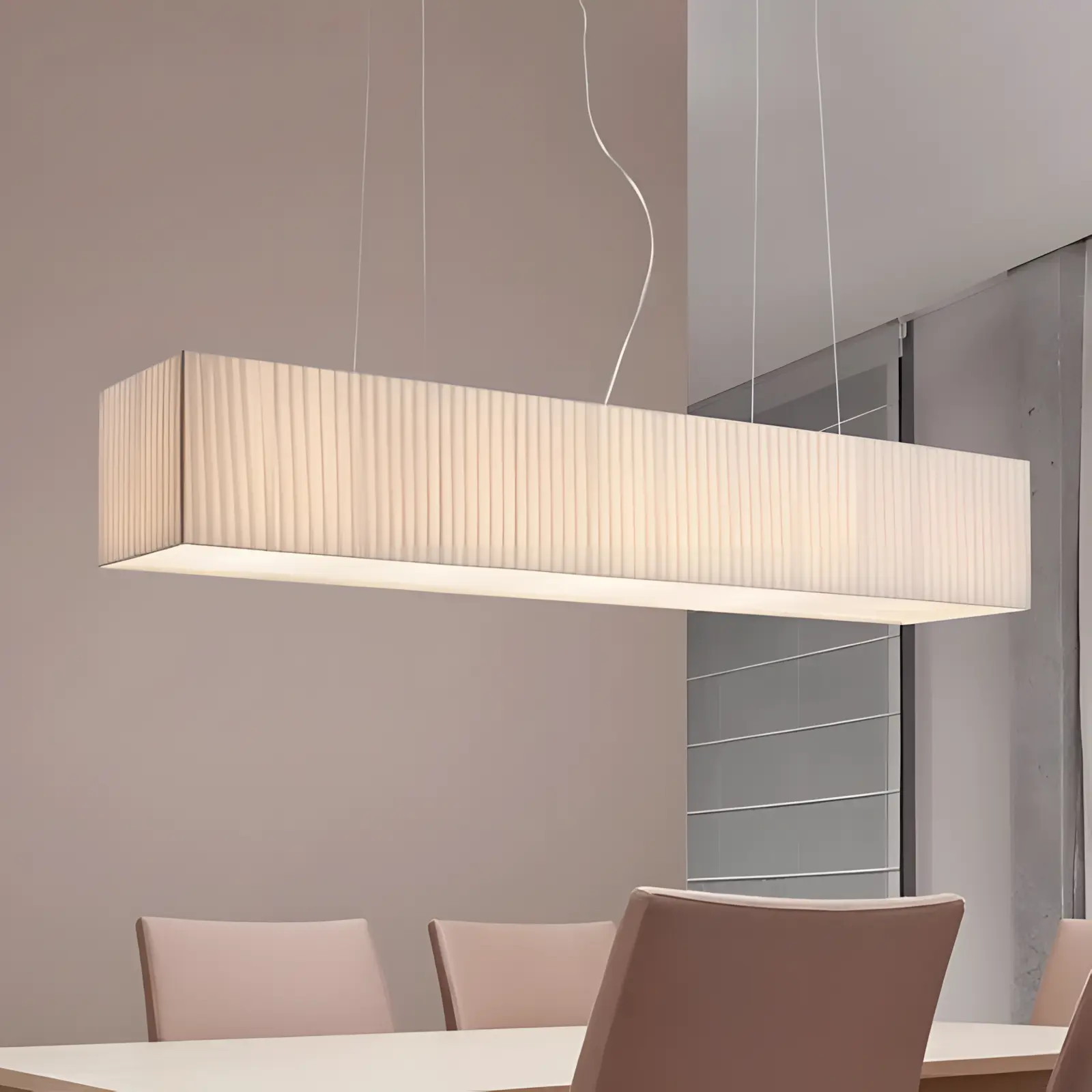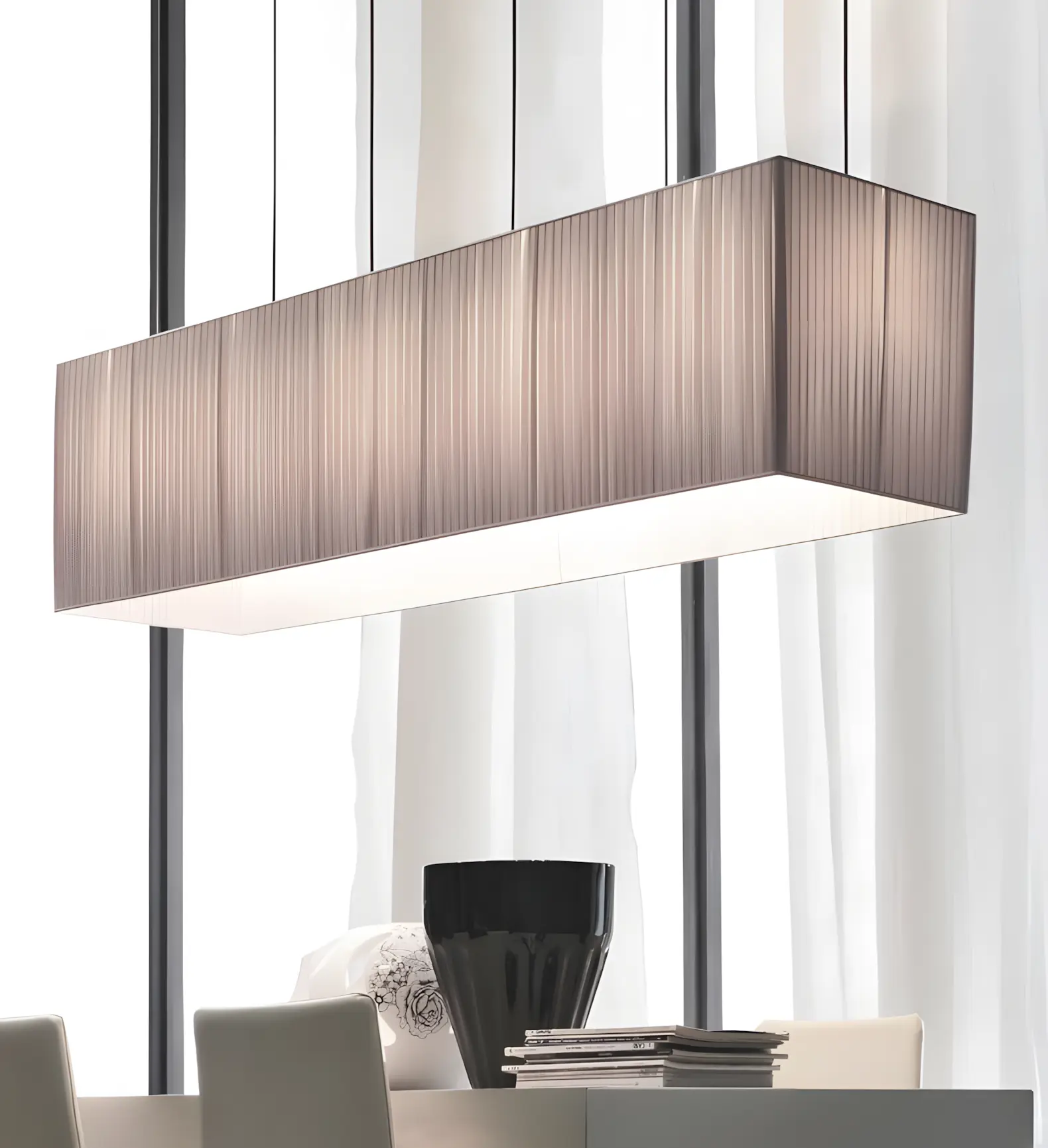 Rettangolo Large Pendant is a modern pick with a long, ribbed linen shade. It has bold straight lines and comes in cotton or pleated plisse—multiple colors to match your space. The shade and bottom diffuser soften light, filling rooms with cozy warmth. Well-crafted for a neat look, it adds elegance and dimension, great for contemporary homes.