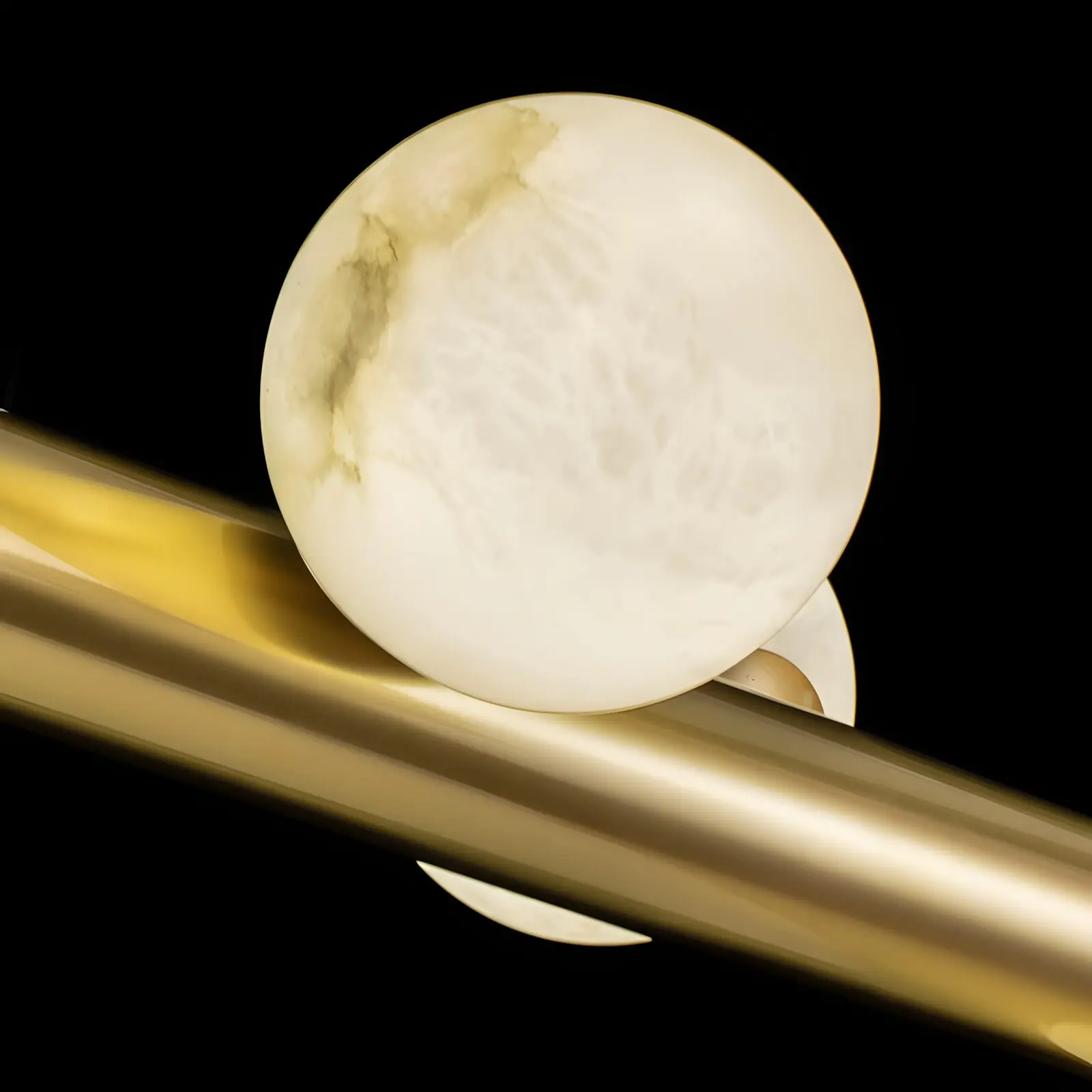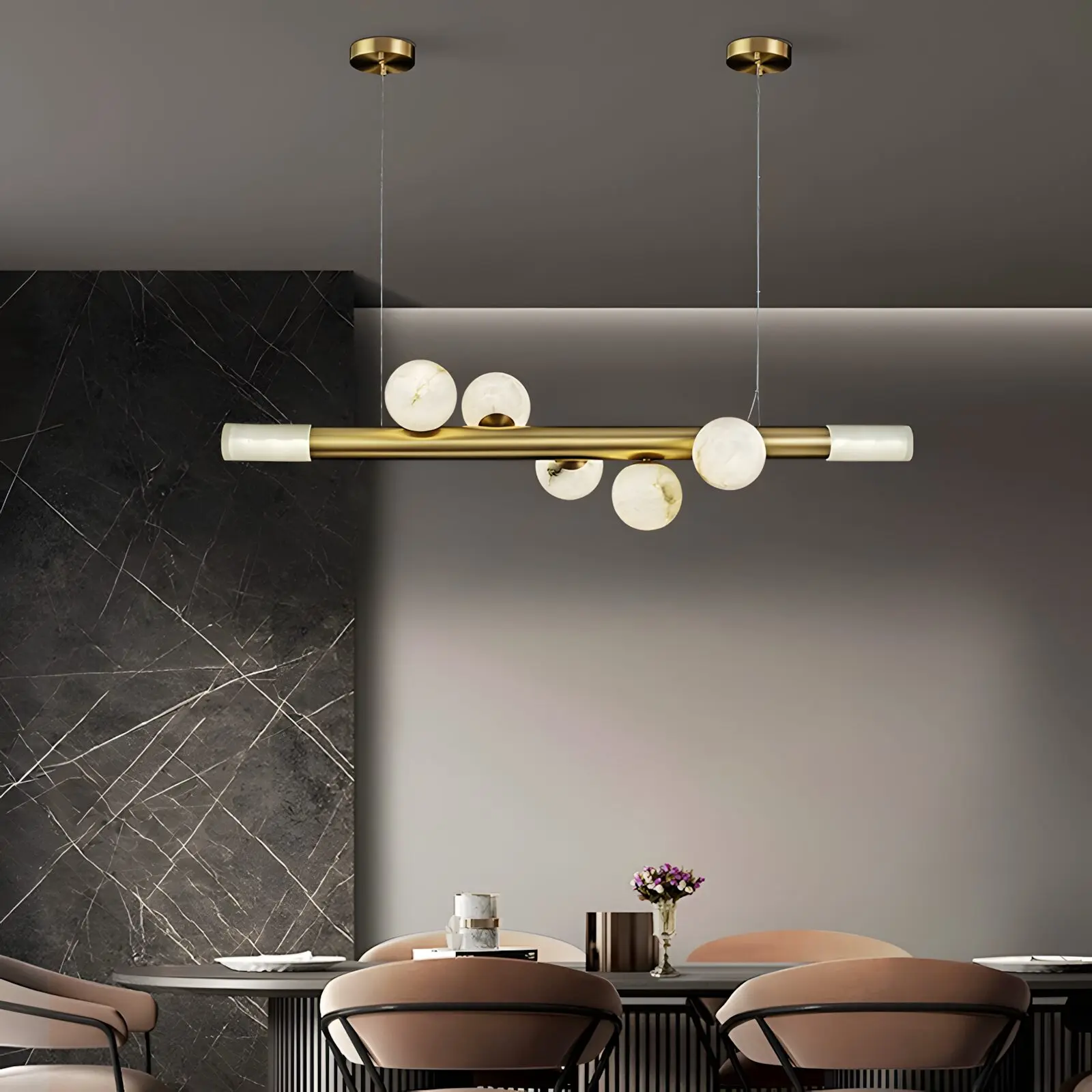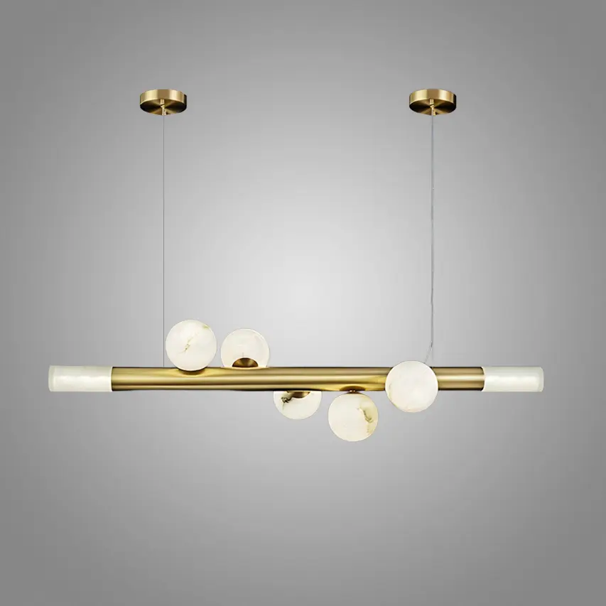 RoMi Carrara Pendant Light blends elegant brass with natural marble accents for a striking contrast. The sleek brass frame features a clean, linear design, with smooth, round marble pieces placed along the length. The marble’s unique veins create an organic feel, adding a touch of nature to the sophisticated fixture. The polished finish enhances the stone’s texture, while the brass complements it with a warm, metallic sheen.