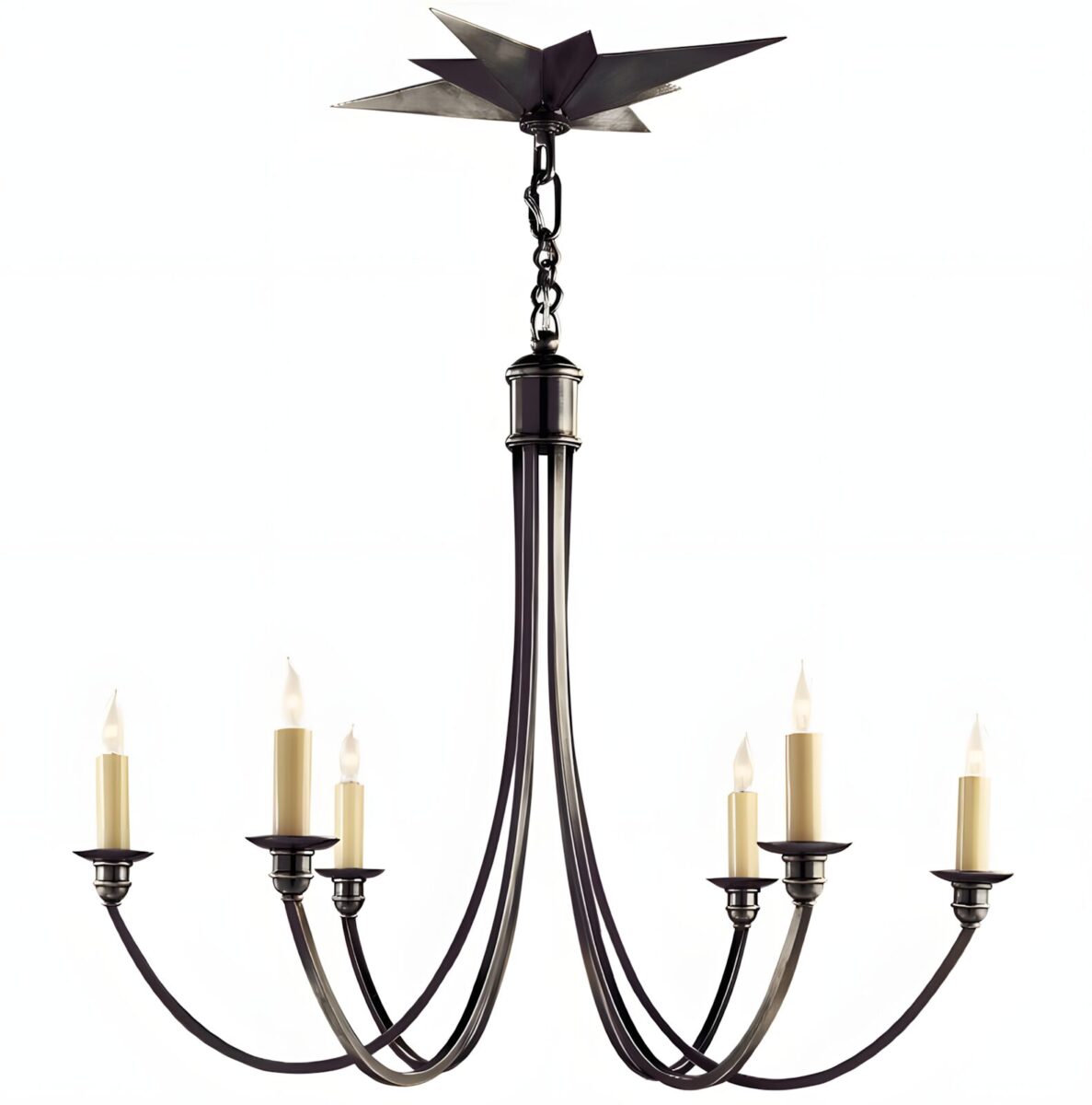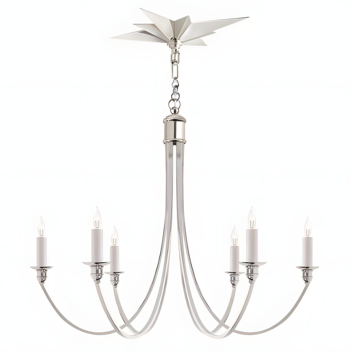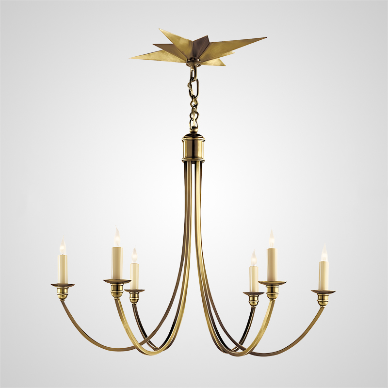 Its classic design features six graceful arms that curve outward, each holding a candle-style light. Made from high-quality brass, the fixture offers a sleek and durable finish, perfect for adding sophistication to traditional and vintage-style interiors. The surface has been carefully treated to achieve a refined, smooth appearance with a lustrous shine.